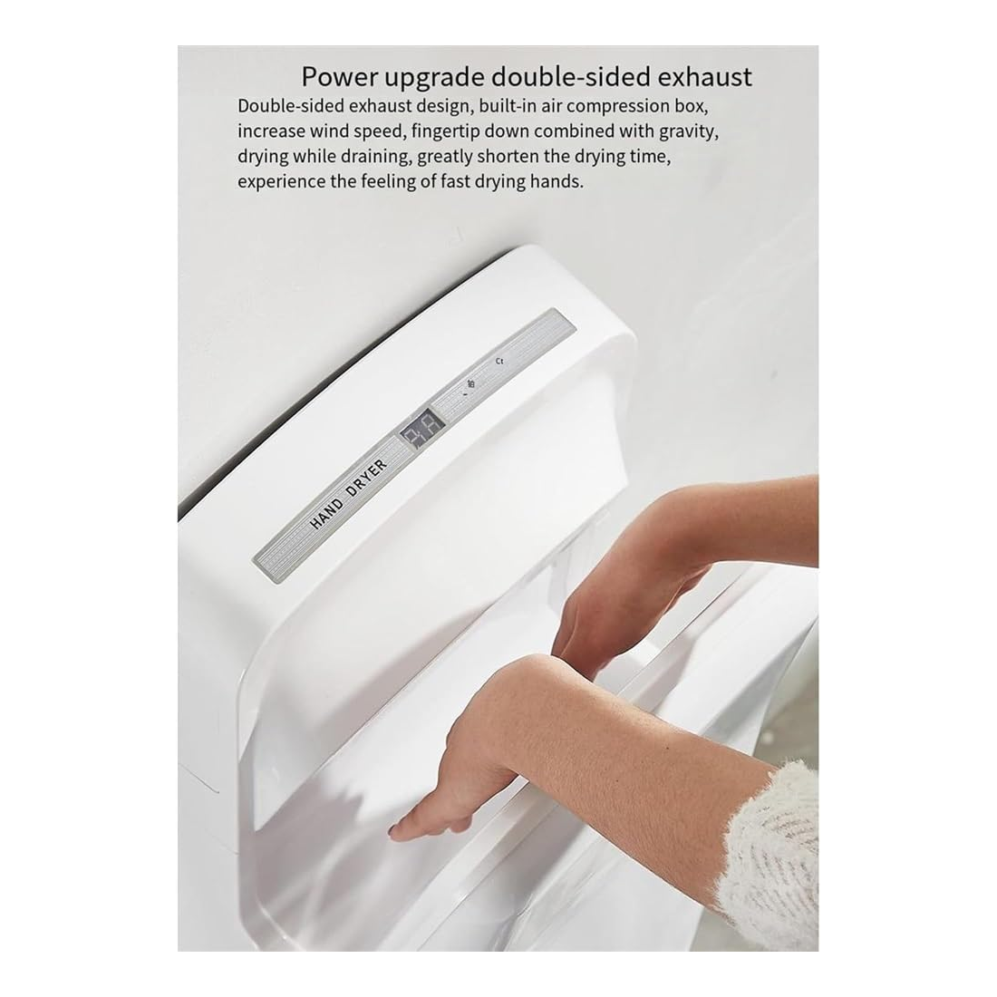 La salida de aire en forma de V de doble cara está diseñada de modo que cuando se enciende la máquina, se pueden soplar 24 columnas de flujo de aire fuertes al mismo tiempo para formar una ranura de viento, que puede secar las manos rápidamente.